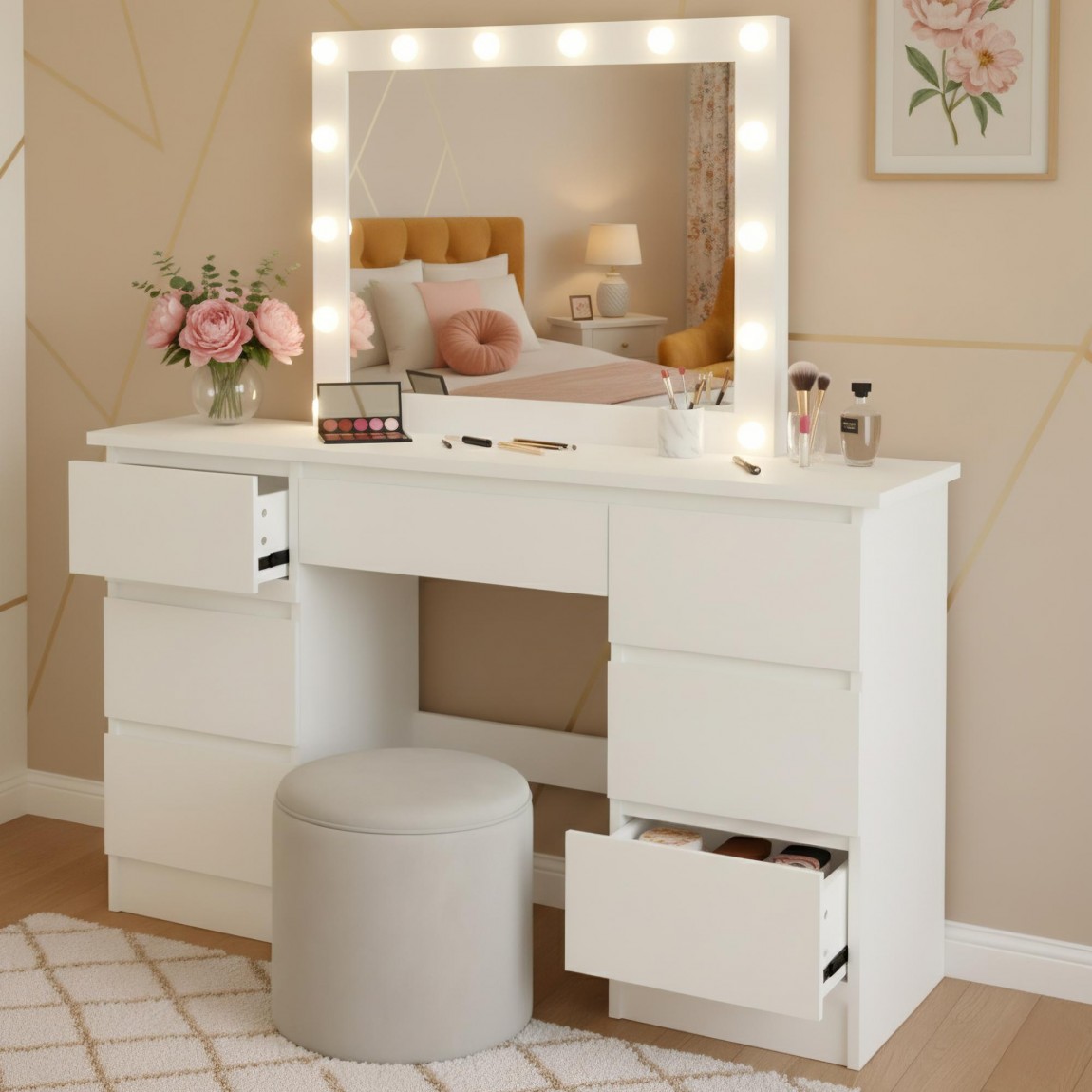 Tualetinis staliukas „Duffy“ – puikus priedas kiekvienai miegamajai ar garderobui. Modernus dizainas ir aiškios linijos suteikia tvarkos ir stiliaus jūsų kasdieninei grožio priežiūros rutinei.