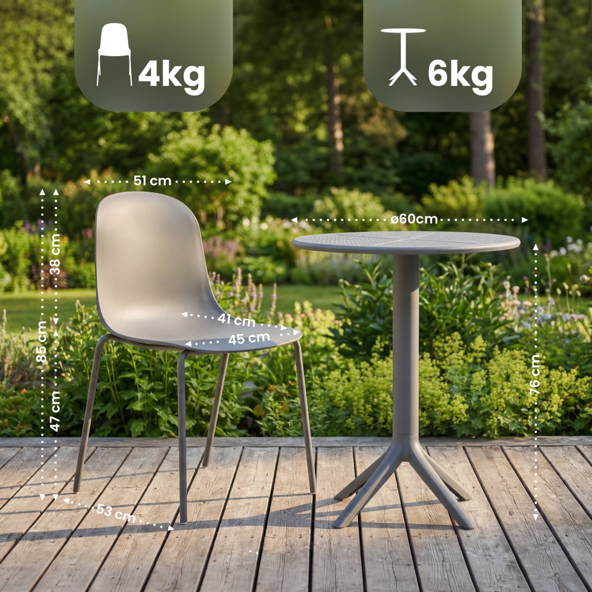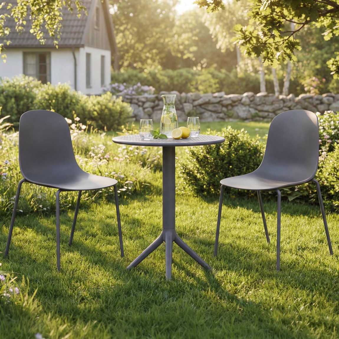 baldų komplektas „Torin“ – tai modernus ir praktiškas pasirinkimas lauko erdvėms, tokioms kaip balkonai, terasos ar sodai. Šį 3 dalių komplektą sudaro apvalus stalas „Lacota“ (60 cm skersmens) ir dvi sukraunamos kėdės „Hardin“. Pagamintas iš aukštos kokybės plastiko, stalas „Lacota“ yra atsparus karščiui, tvirtas ir visiškai perdirbamas.
